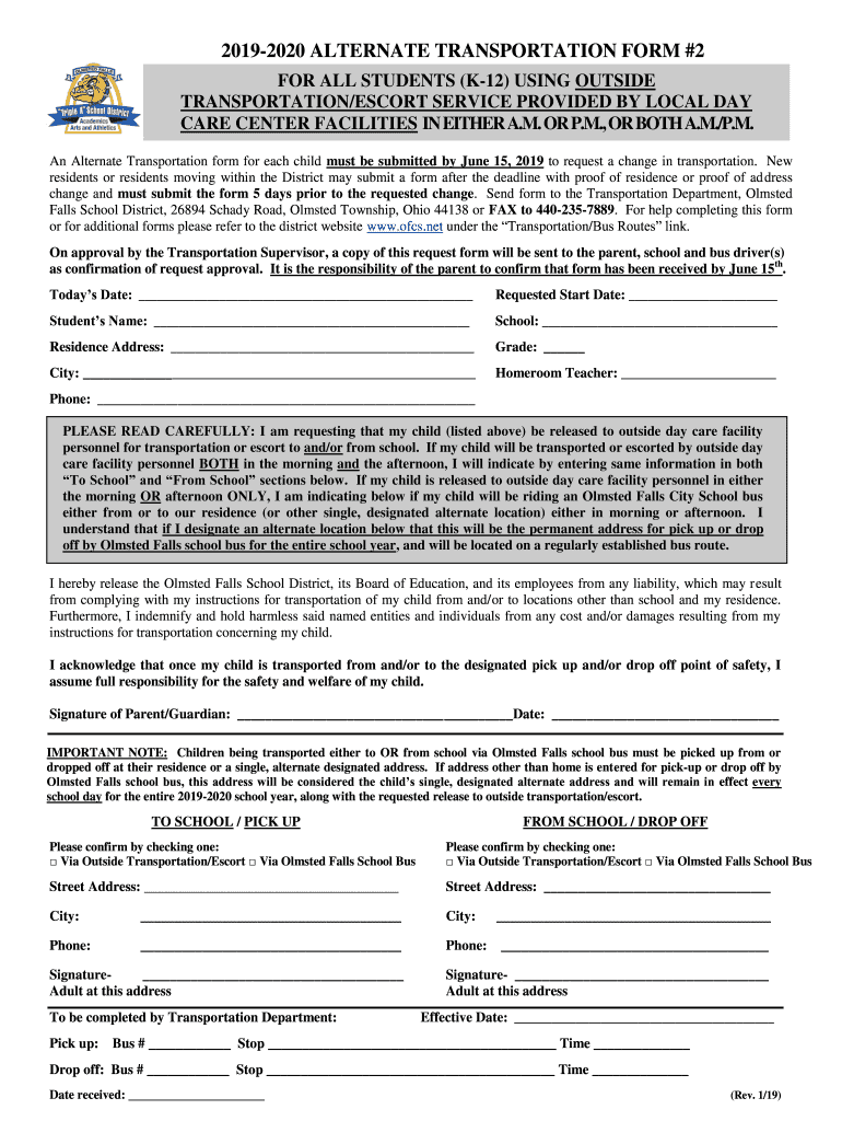 Get the free 2019-2020 ALTERNATE TRANSPORTATION FORM #2