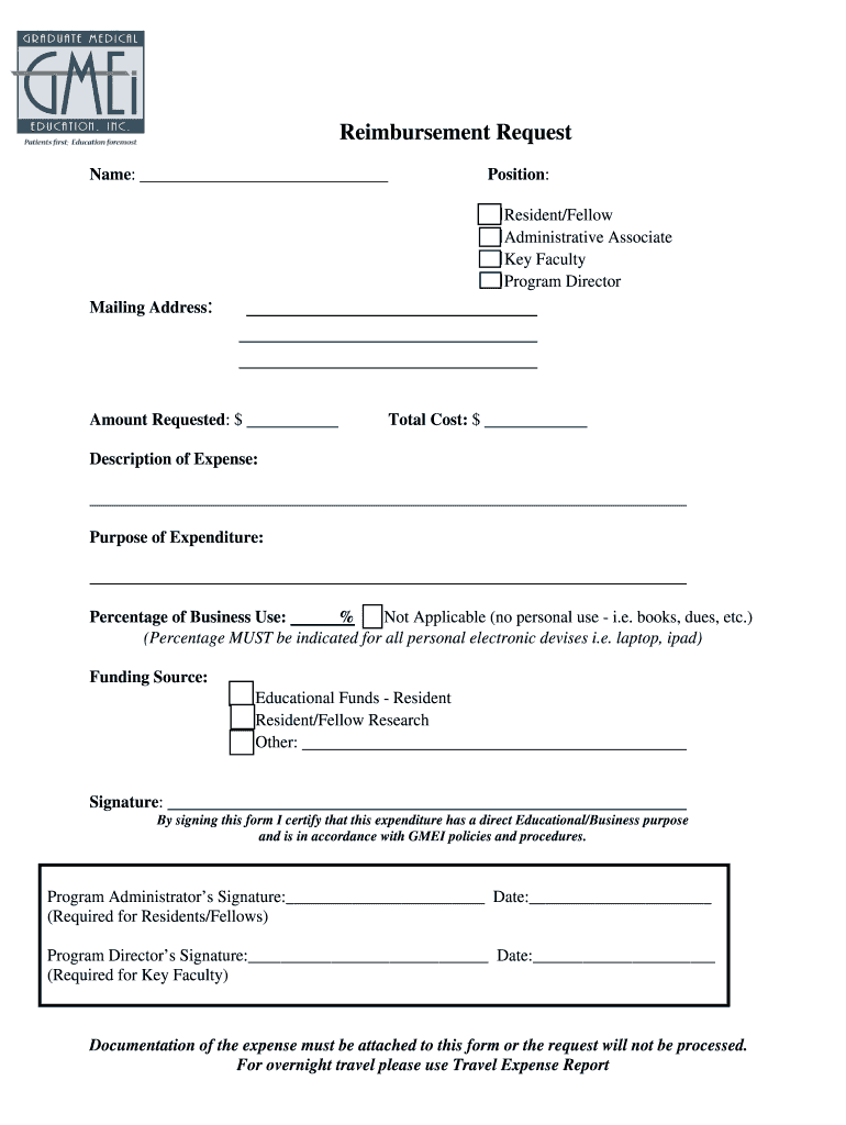 Reimbursement Request Name:Position: Resident/Fellow Administrative Associate Key Faculty Program DirectorMailing Address:Amount Requested: total Cost: description of Expense:Purpose of Expenditure:Percentage