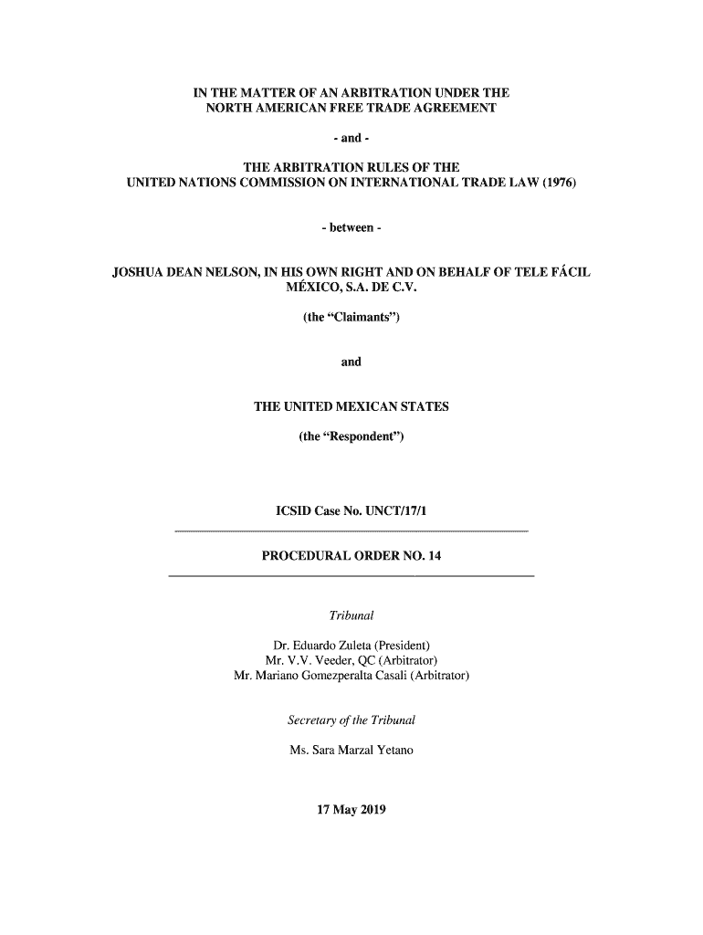 IN THE MATTER OF AN ARBITRATION UNDER THE NORTH AMERICAN FREE TRADE AGREEMENT and THE ARBITRATION RULES OF THE UNITED NATIONS COMMISSION ON INTERNATIONAL TRADE LAW (1976) between JOSHUA DEAN NELSON,