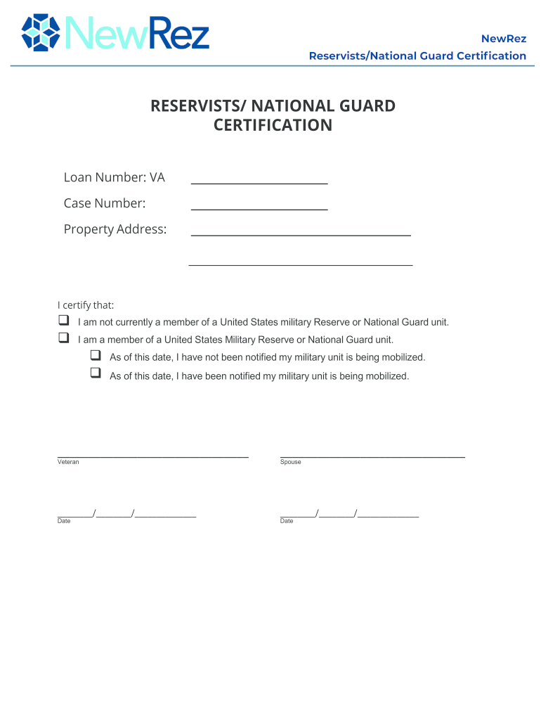 Newer Reservists/National Guard CerticationRESERVISTS/ NATIONAL GUARD CERTIFICATION Loan Number: VA Case Number: Property Address:I certify that:q QI am not currently a member of a United States military