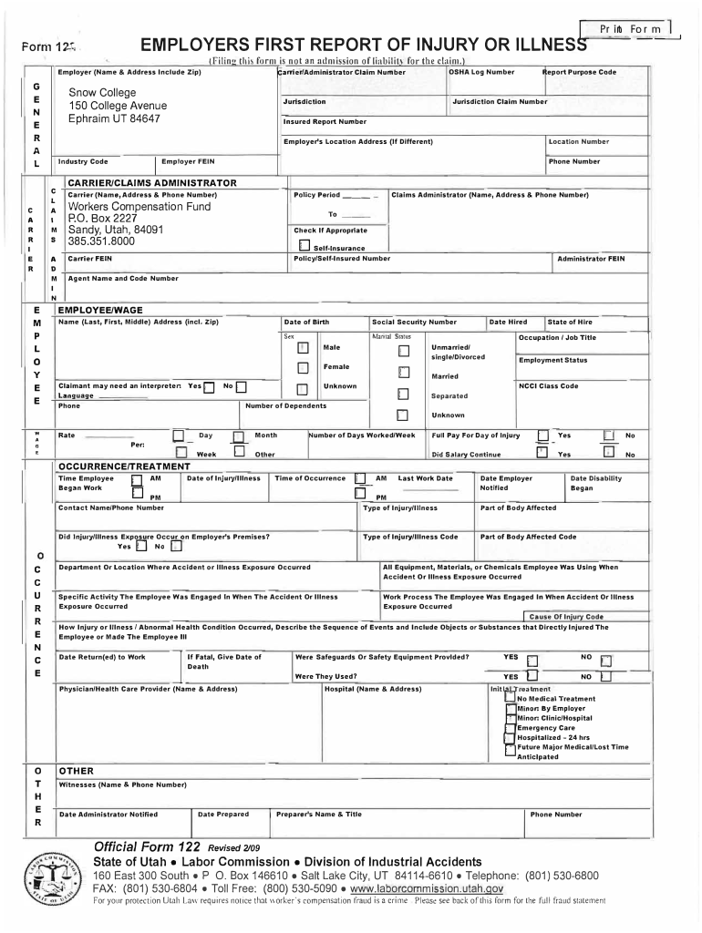 EMPLOYERS FIRST REPORT OF INJURY OR ILLNESS KIR n F t o Mr. J “Porn, 1:, Employer (Name & Address Include Zip)G E N E R A LRI MEARDARsIE MPM IN Industry CodeIJurisdictionEmployer FEINCARRIER/CLAIMS