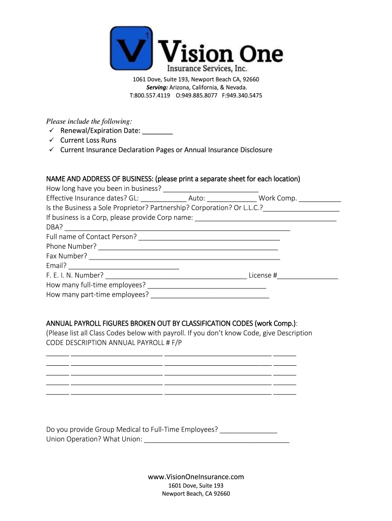 1061 Dove, Suite 193, Newport Beach CA, 92660 Serving: Arizona, California, & Nevada. T:800.557.4119 O:949.885.8077 F:949.340.5475Please include the following: Renewal/Expiration Date: Current Loss