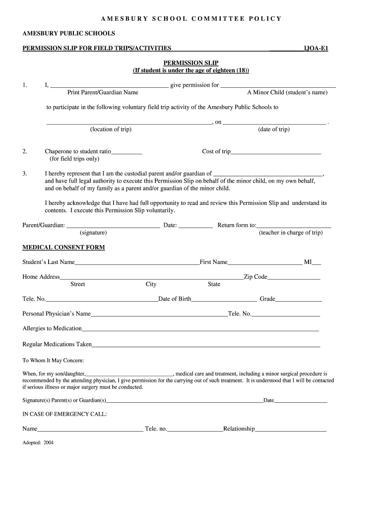 AMESBURY SCHOOL COMMITTEE POLICY AMESBURY PUBLIC SCHOOLS PERMISSION SLIP FOR FIELD TRIPS/ACTIVITIES IJOAE1PERMISSION SLIP (If student is under the age of eighteen (18)) 1. I, give permission for Print