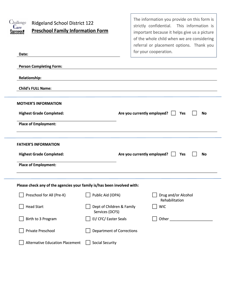 RidgelandSchoolDistrict122 PreschoolFamilyInformationFormTheinformationyouprovideonthisformis strictly confidential. This information is importantbecauseithelpsgiveusapicture ofthewholechildwhenweareconsidering