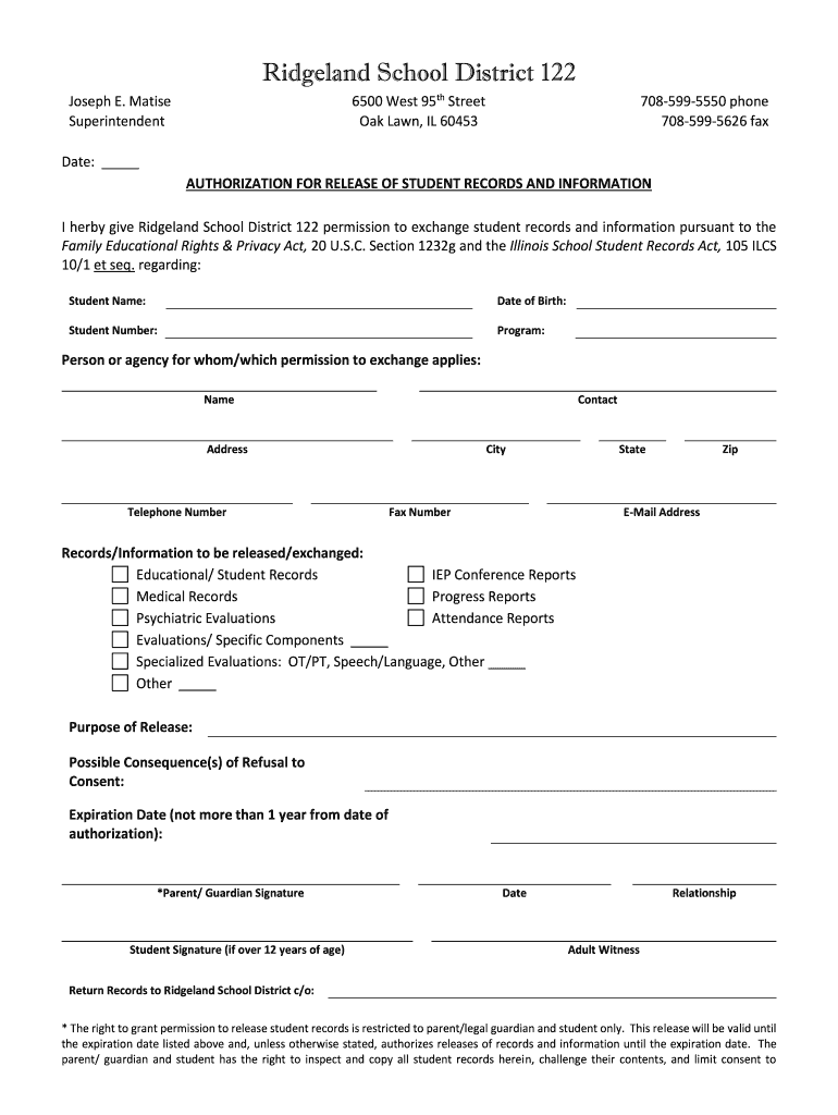 Ridgeland School District 122 6500 West 95th Street Oak Lawn, IL 60453Joseph E. Matisse Superintendent7085995550 phone 7085995626 mandates: AUTHORIZATION FOR RELEASE OF STUDENT RECORDS AND INFORMATION