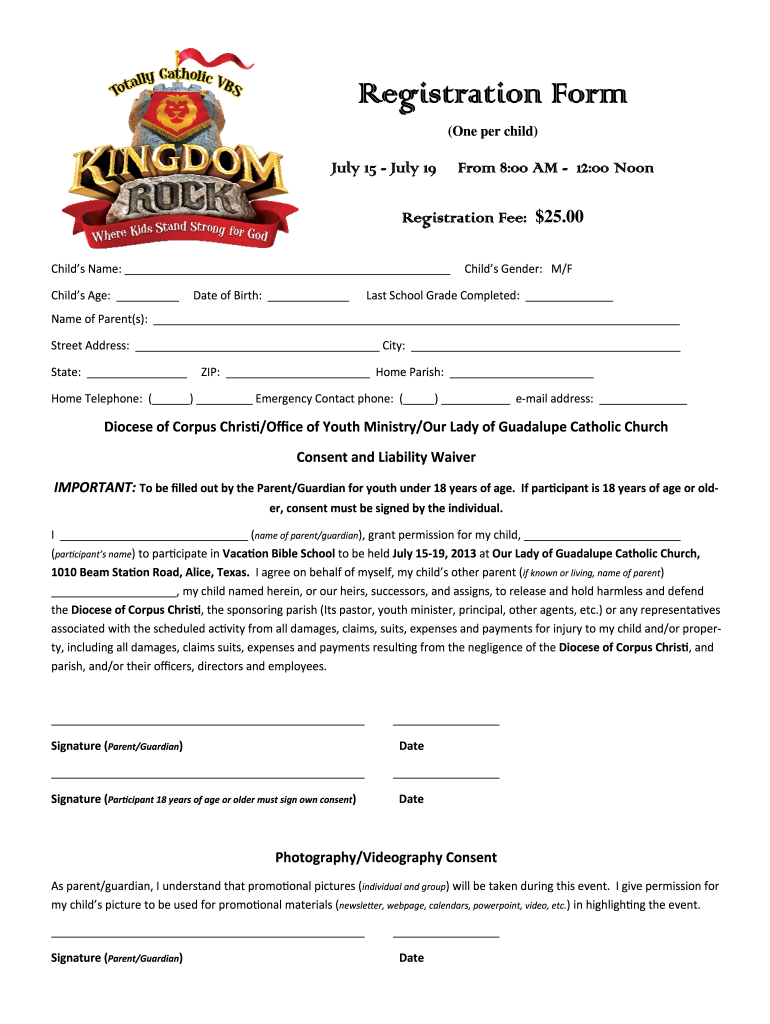 Registration Form (One per child)July 15 July 19From 8:00 AM 12:00 NoonRegistration Fee: $25.00 Childcare: Childminder’M/F Childcare: DateofBirth: LastSchoolGradeCompleted: NameofParent(s): StreetAddress: