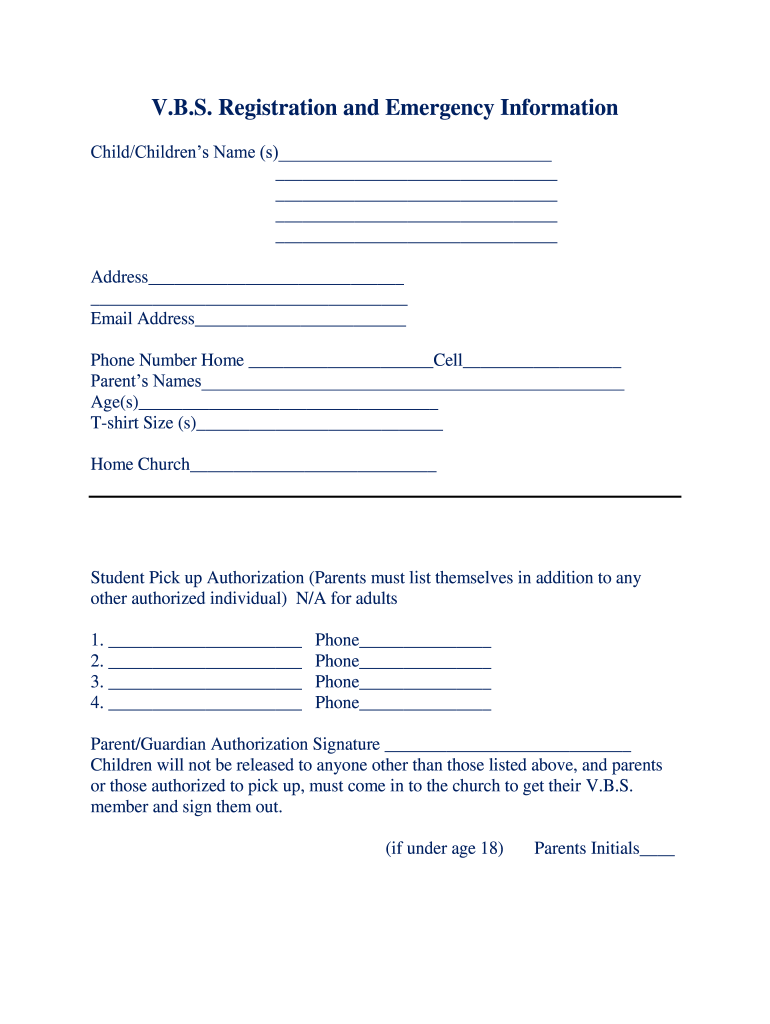 V.B.S. Registration and Emergency Information Child/Children's Name (s) Address Email Address Phone Number Home Cell Parents Names Age(s) Shirt Size (s) Home Church Student Pick up Authorization (Parents