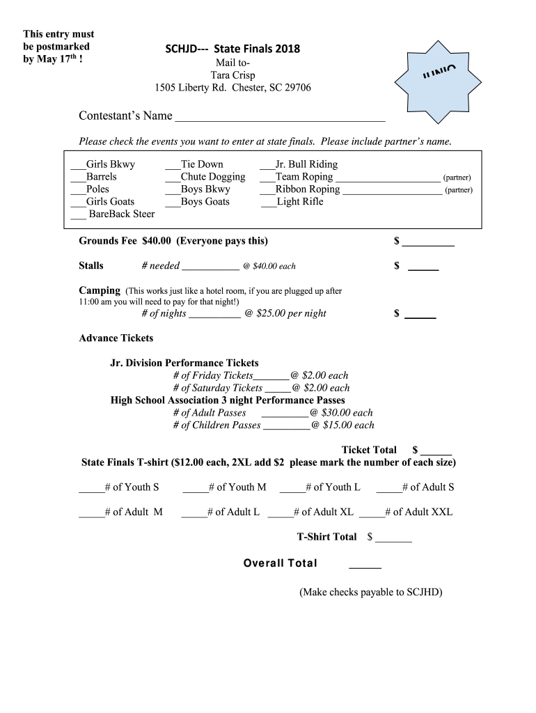 This entry must be postmarked by May 17th !SCHJDStateFinals2018 Mail to Tara Crisp 1505 Liberty Rd. Chester, SC 29706Contestants Name Please check the events you want to enter at state finals. Please