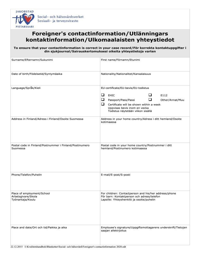 Get the free Foreigner's contactinformation/Utlnningars ...