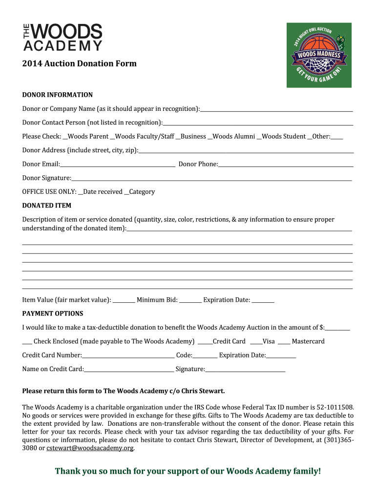 2014 Auction Donation Form DONOR INFORMATION Donor or Company Name (as it should appear in recognition): Donor Contact Person (not listed in recognition): Please Check: Woods Parent Woods Faculty/Staff