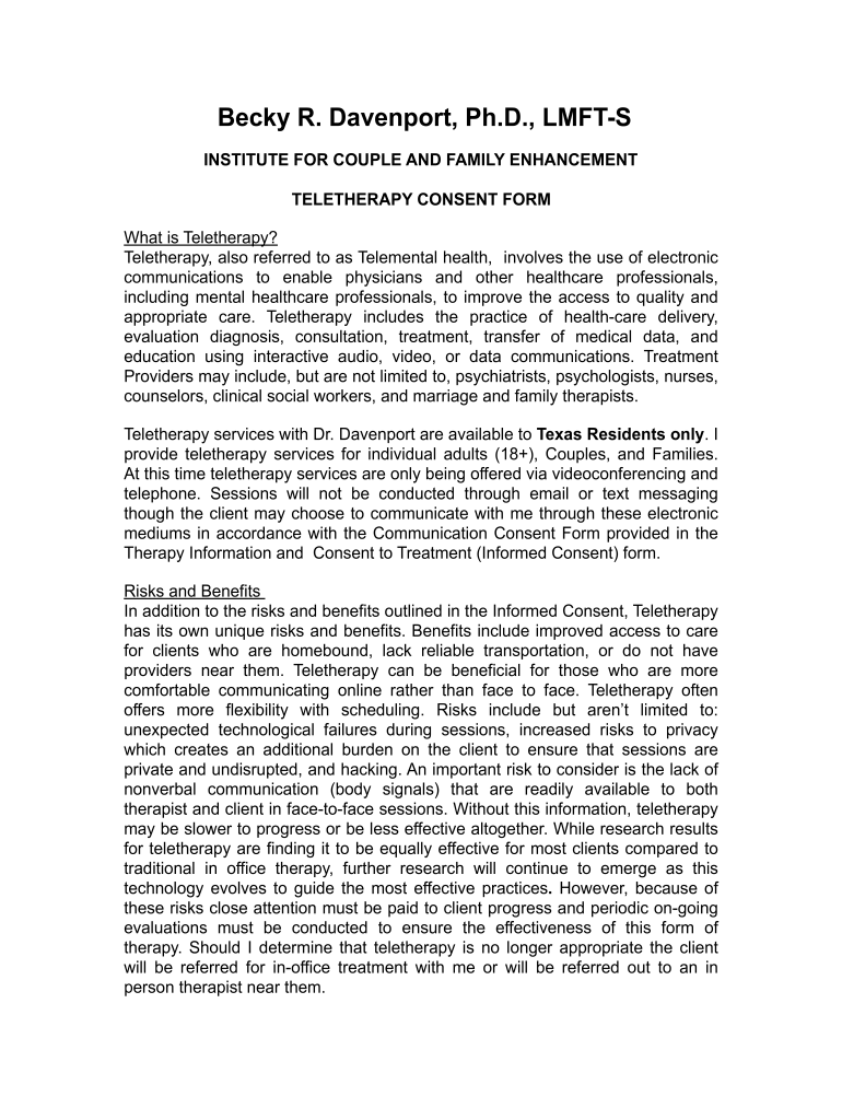 Clients who wish to receive teletherapy services from a licensed therapist or mental health professional are required to file the Davenport teletherapy consent form.