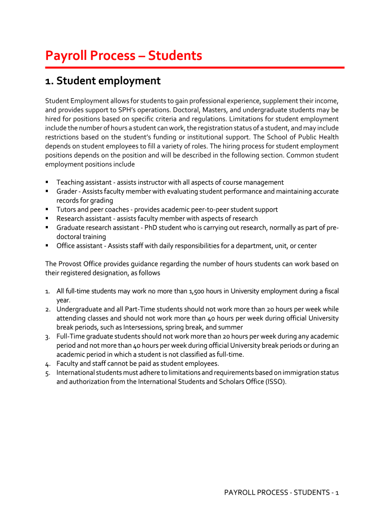 Payroll Process Students 1. Student employment allows for students to gain professional experience, supplement their income, and provides support to Spas operations. Doctoral, Masters, and undergraduate