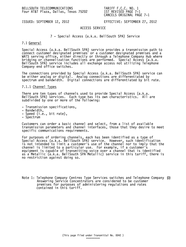 SELLOUT TELECOMMUNICATIONS Four AT&T Plaza, Dallas, Texas 75202TARIFF F.C.C. NO. 1 1ST REVISED PAGE 71 CANCELS ORIGINAL PAGE 71ISSUED: SEPTEMBER 12, 2012EFFECTIVE: SEPTEMBER 27, 2012, ACCESS SERVICE7