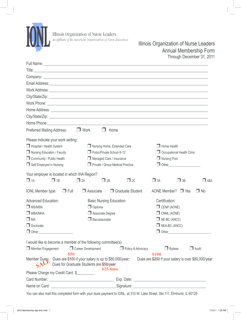 Illinois Organization of Nurse Leaders Annual Membership Forethought December 31, 2011Full Name: Title: Company: Email Address: Work Address: City/State/Zip: Work Phone: Home Address: City/State/Zip: