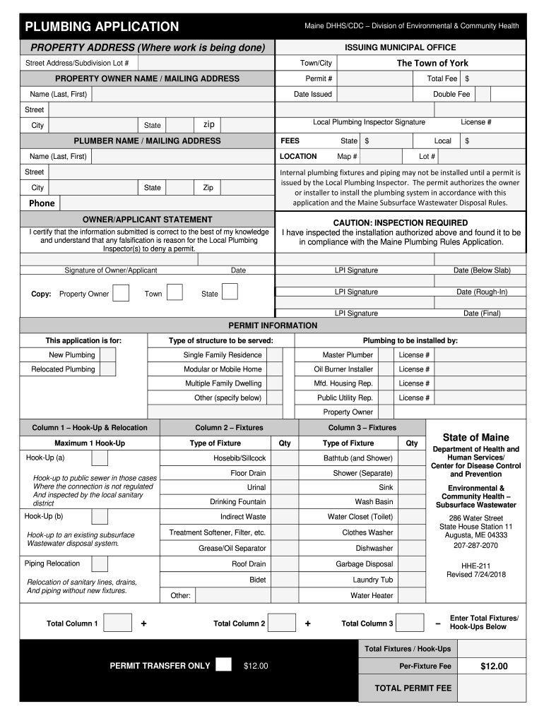 Maine HHS/CDC Division of Environmental & Community HealthPLUMBING APPLICATION PROPERTY ADDRESS (Where work is being done)ISSUING MUNICIPAL OFFICEStreet Address/Subdivision Lot #The Town of Yorktown/CityPROPERTY