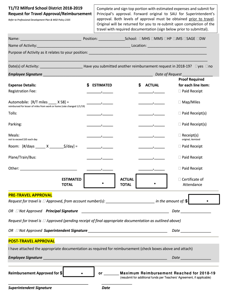 Refer to Professional Development Plan & MSD Policy 2335Complete and sign top portion with estimated expenses and submit