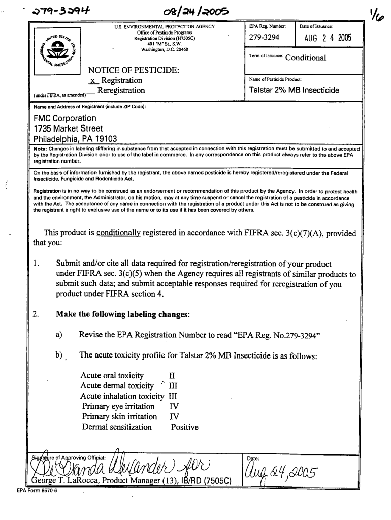 Get the free U.S. EPA, Pesticide Product Label, TALSTAR 2% MB INSECTICIDE, 08/24/2005. Pesticide ...