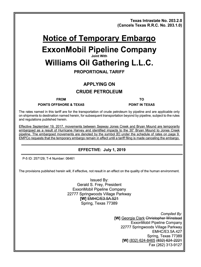 Texas Intrastate No. 203.2.0 (Cancels Texas R.R.C. No. 203.1.0)Notice of Temporary Embargo ExxonMobil Pipeline Company Joint With Williams Oil Gathering L.L.C. PROPORTIONAL TARIFFAPPLYING ON CRUDE