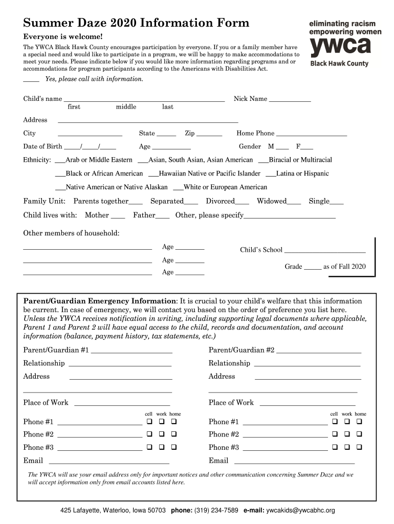 Summer Daze 2020 Information Form Everyone is welcome! The YWCA Black Hawk County encourages participation by everyone. If you or a family member have a special need and would like to participate