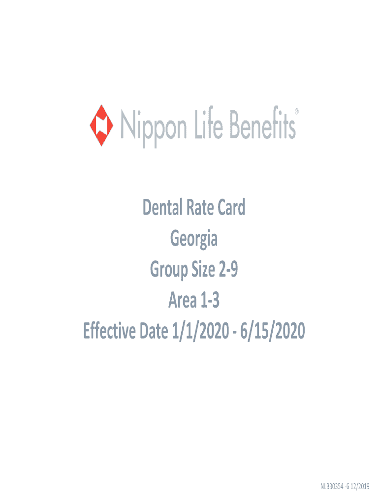 Dental Rate Card Georgia Group Size 29 Area 13 Effective Date 1/1/2020 6/15/2020NLB30354 6 12/2019Nippon Life Insurance Company of AmericaDENTAL RATE CARD Groups 29 enrolled GA 2 Georgia Rate Area