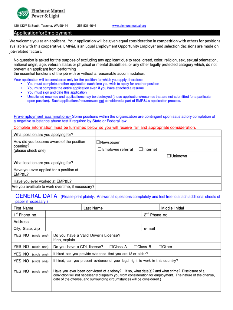 120 132nd St South, Tacoma, WA 984442535314646www.elmhurstmutual.orgApplicationforEmployment We welcome you as an applicant. Your application will be given equal consideration in competition with