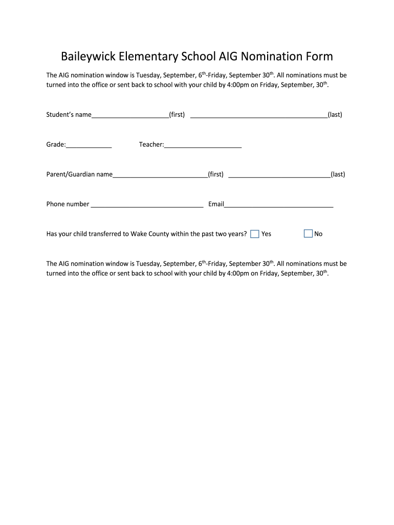 Bailey wick Elementary School AIG Nomination Form The AIG nomination window is Tuesday, September, 6thFriday, September 30th. All nominations must be turned into the office or sent back to school