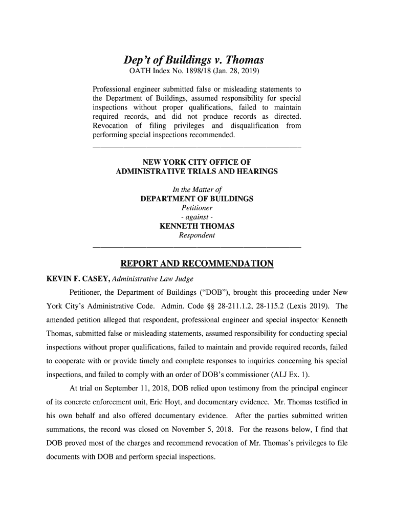 Dept of Buildings v. Thomas OATH Index No. 1898/18 (Jan. 28, 2019) Professional engineer submitted false or misleading statements to the Department of Buildings, assumed responsibility for special