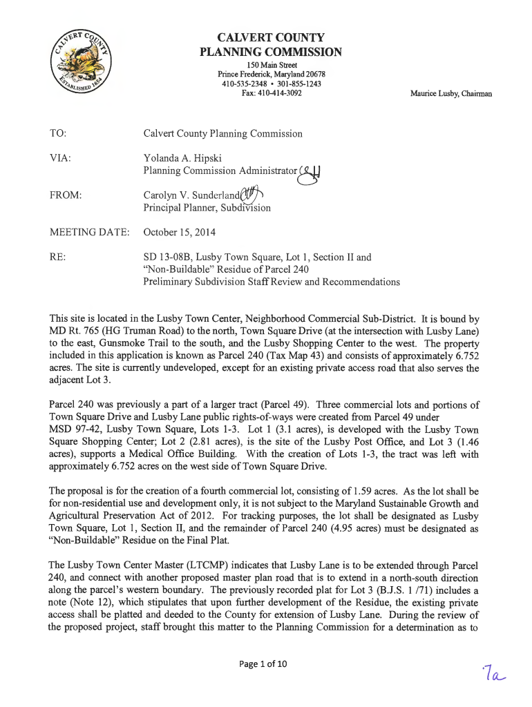 CALVERT COUNTY PLANNING COMMISSION 150 Main Street Prince Frederick, Maryland 20678 4105352348 3018551243 Fax: 4104143092TO:Calvert County Planning Commission:Yolanda A. Hip ski Planning Commission