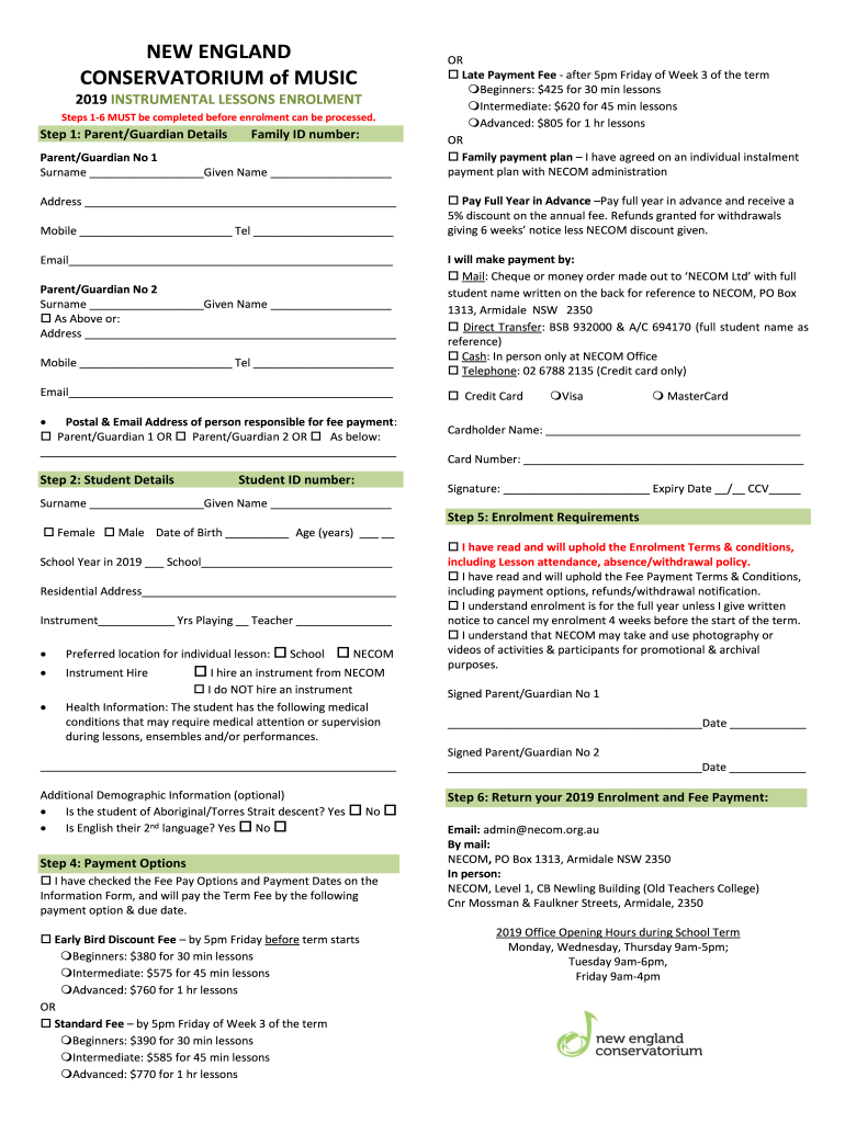 NEW ENGLAND CONSERVATORIES of MUSIC 2019 INSTRUMENTAL LESSONS Enrollment Steps 16 MUST be completed before enrollment can be processed. Step 1: Parent/Guardian DetailsFamily ID number:Parent/Guardian