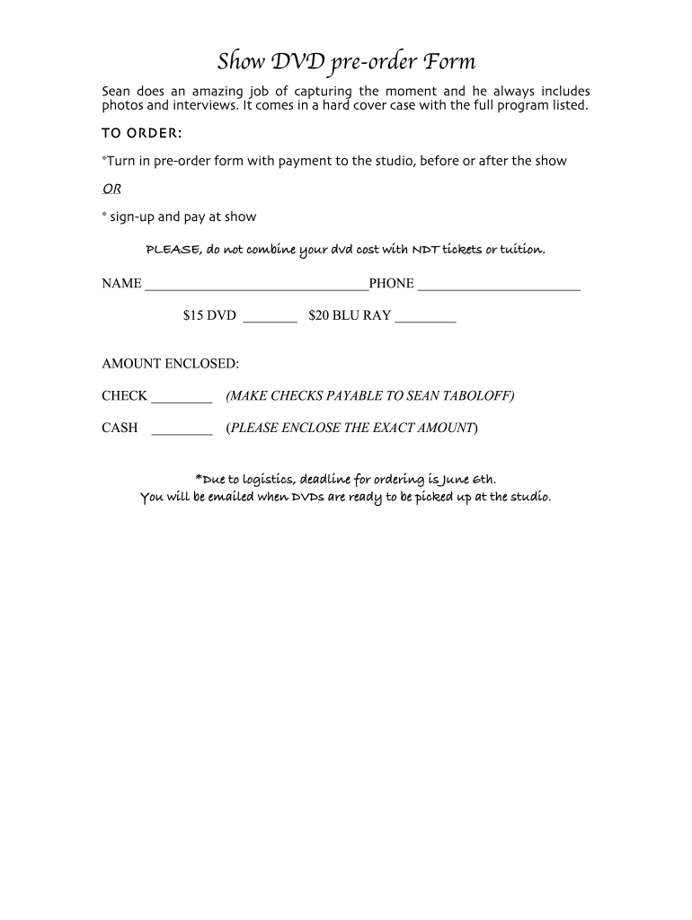 Show DVD preorder Form Sean does an amazing job of capturing the moment, and he always includes photos and interviews. It comes in a hard cover case with the full program listed. TO ORDER: *Turn in