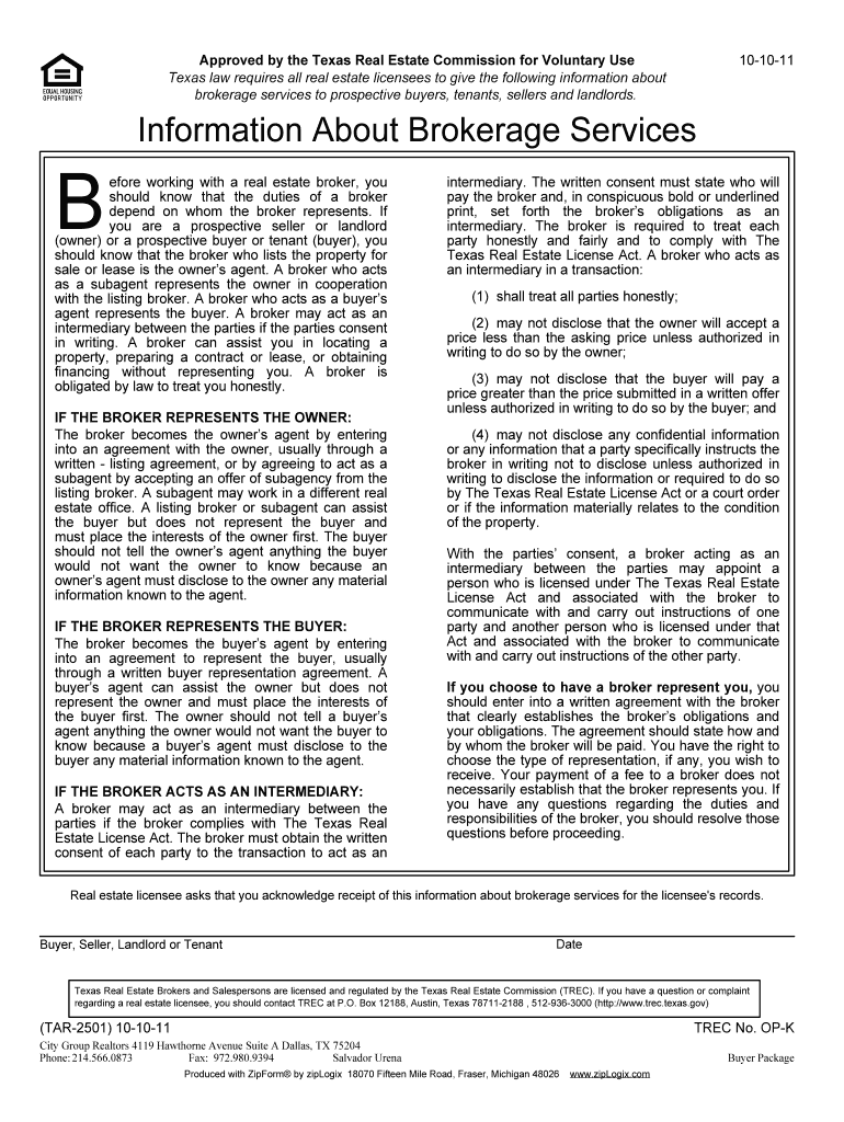 Approved by the Texas Real Estate Commission for Voluntary Use Texas law requires all real estate licensees to give the following information about brokerage services to prospective buyers, tenants,