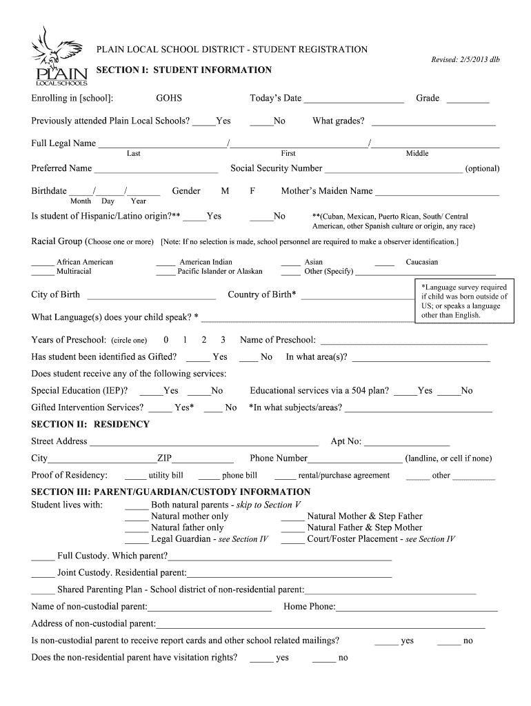 PLAIN LOCAL SCHOOL DISTRICT STUDENT REGISTRATION Revised: 2/5/2013 dissection I: STUDENT INFORMATION Enrolling in school :GOHSTodays Date Previously attended Plain Local Schools? Yes Grade What grades?