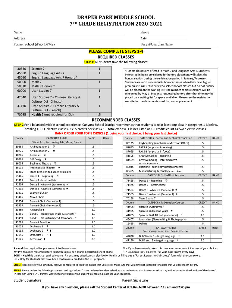 DRAPER PARK MIDDLE SCHOOL7TH GRADE REGISTRATION 20202021Name Phone Address City Former School (if not DAMS) Parent/Guardian Name PLEASE COMPLETE STEPS 14 REQUIRED CLASSESSTEP 1: All students take
