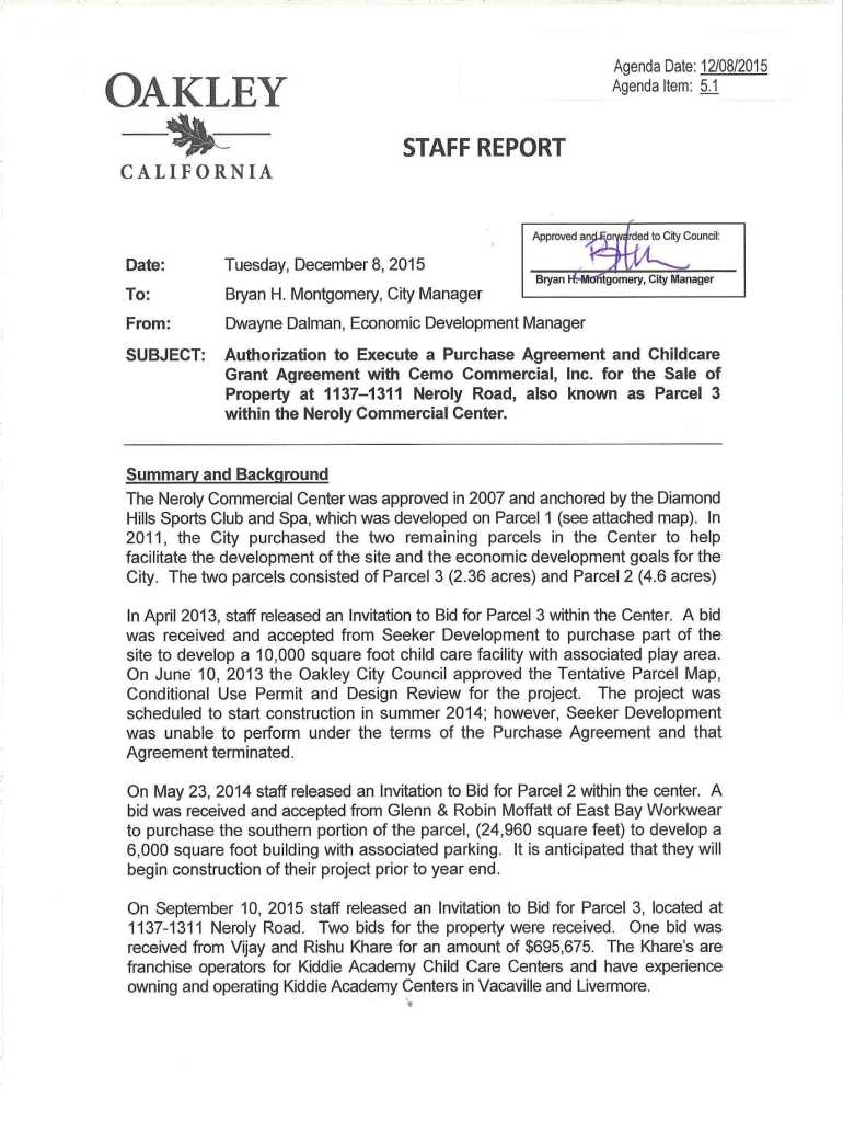 STAFF REPORTCALIFORNIADate:Tuesday, December 8, 2015To:Bryan H. Montgomery, City ManagerFrom:Dwayne Dalian, Economic Development ManagerSUBJECT:Authorization