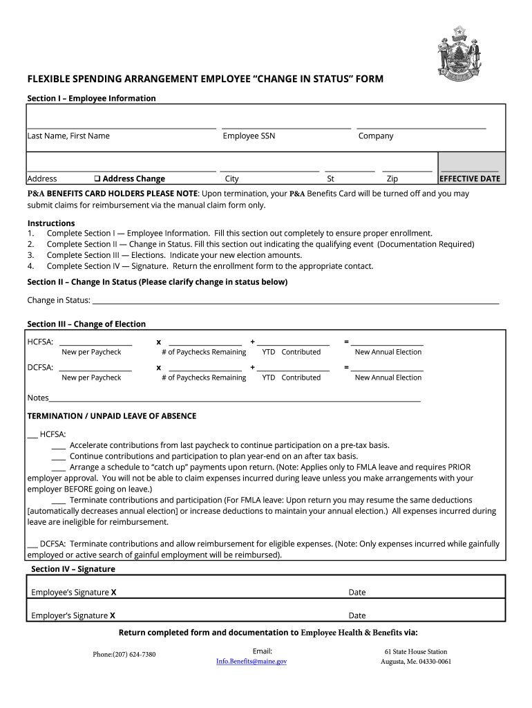 FLEXIBLE SPENDING ARRANGEMENT EMPLOYEE CHANGE IN STATUS FORM Section I Employee Information Last Name, First NameEmployee Company Address ChangeCitySt Zip EFFECTIVE DATA BENEFITS cardholders PLEASE
