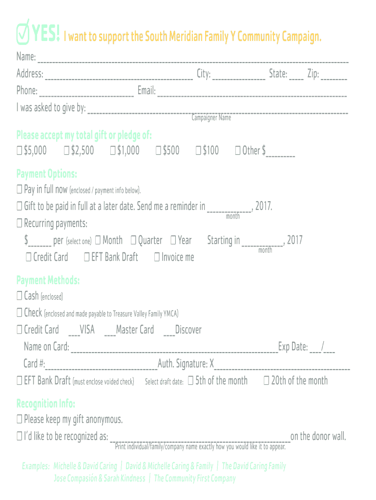 YES! I want to support the South Meridian Family Y Community Campaign. Name: Address: City: State: Zip: Phone: Email: I was asked to give by: Campaigner Nameplate accept my total gift or pledge of: