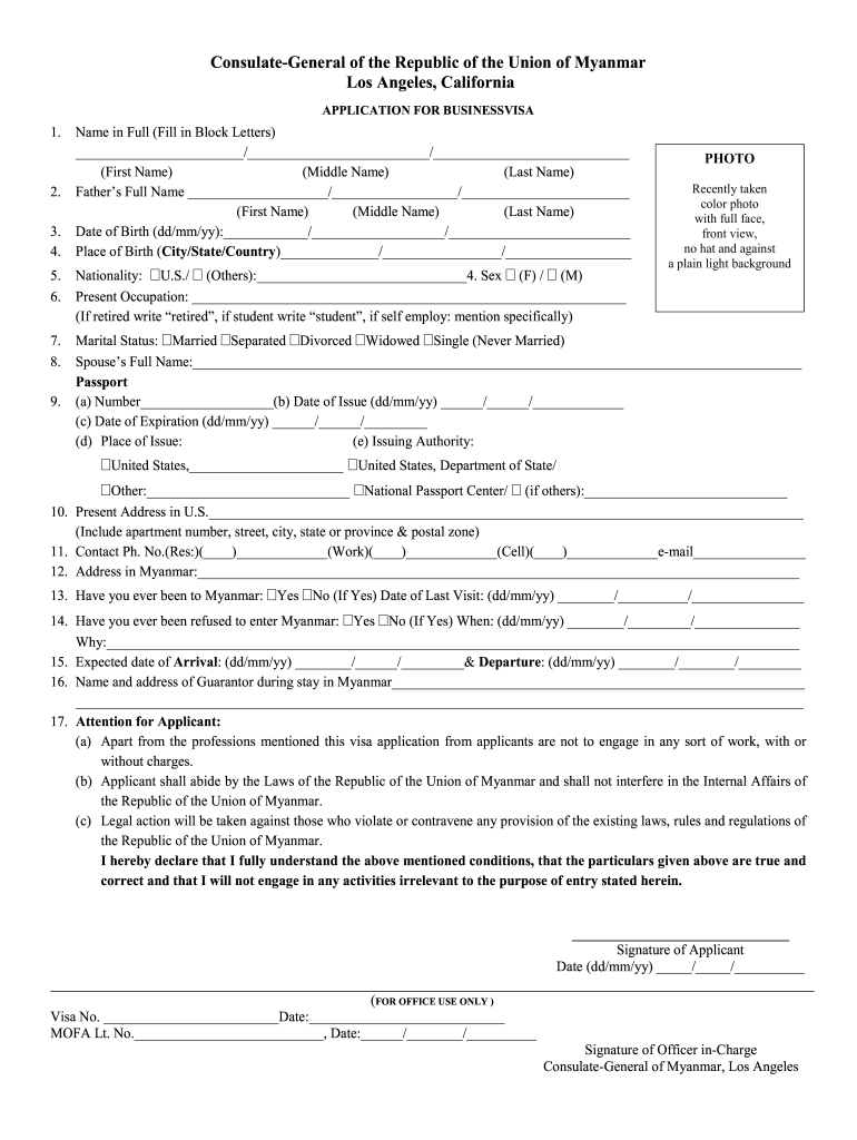 ConsulateGeneral of the Republic of the Union of Myanmar Los Angeles, California APPLICATION FOR BUSINESSVISA1.2. 3. 4. Name in Full (Fill in Block Letters) / / (First Name) (Middle Name) (Last Name)