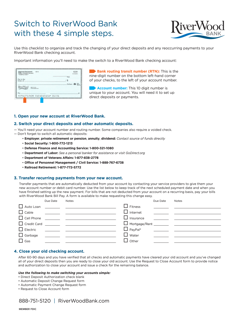 Switch to Riverwood Bank refers to the process of changing your banking services and accounts from your current bank to Riverwood Bank.