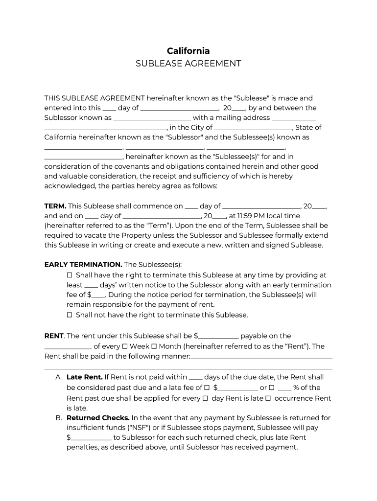 California SUBLEASE AGREEMENTS SUBLEASE AGREEMENT hereinafter known as the “Sublease is made and entered into this day of, 20, by and between the Sublessor known as with a mailing address, in the