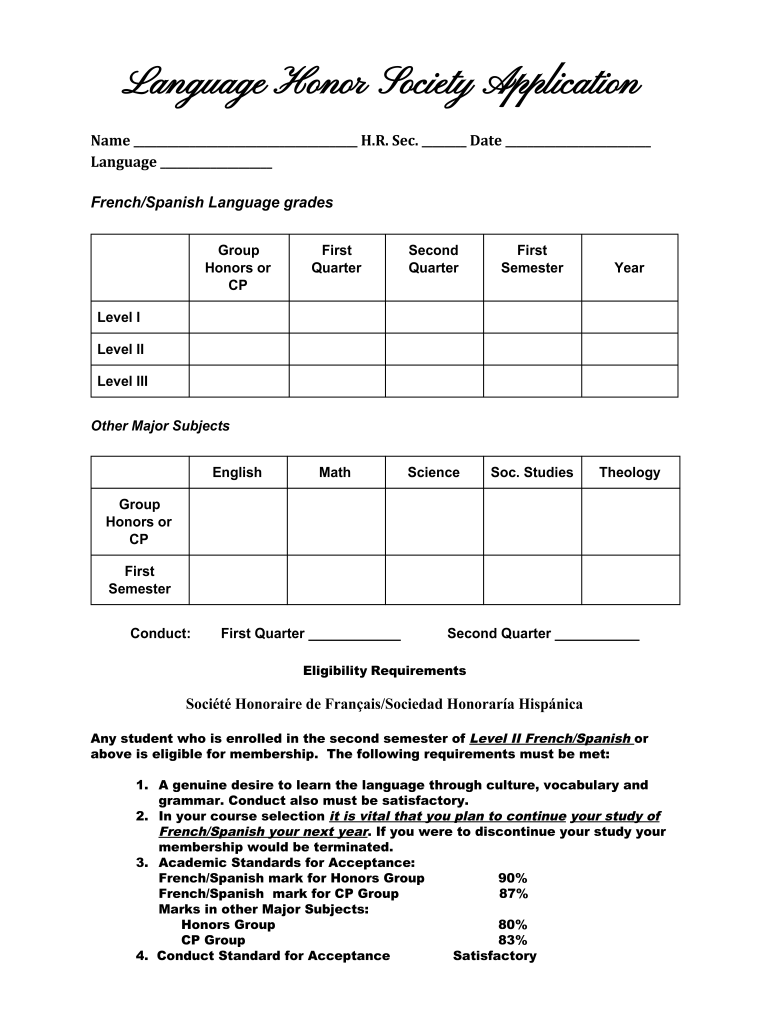 Language Honor Society Application Name H.R. Sec. Date Language French/Spanish Language grades Group Honors or First QuarterSecond Quarterfinal SemesterMathScienceSoc. StudiesYearLevel I Level II
