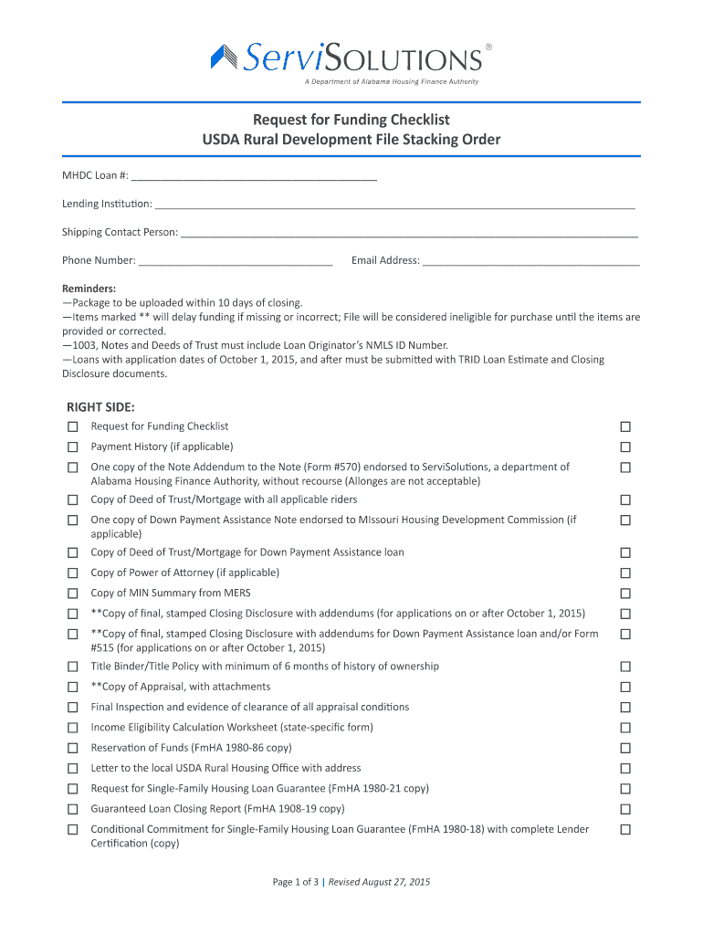 The USDA Rural Development Request for Funding Checklist is a loan application form used by lending institutions to ensure all required documents are provided for USDA Rural Housing loan funding.