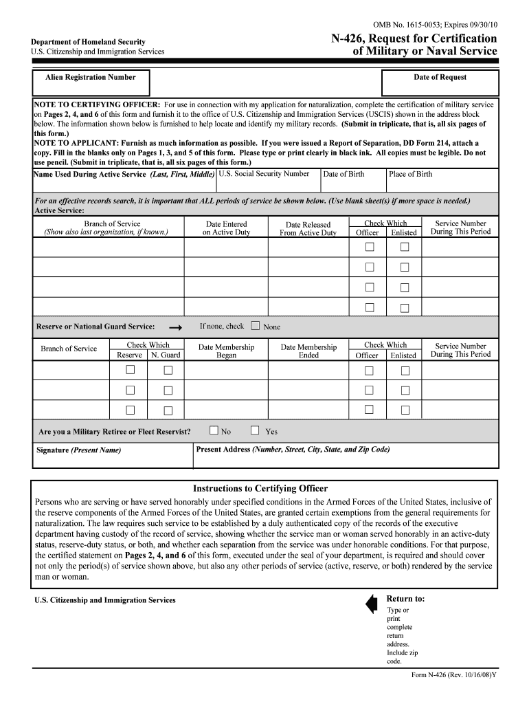OMB No. 1615-0053; Expires 09/30/10 N-426, Request for Certification of Military or Naval Service Department of Homeland Security U.S. Citizenship and Immigration Services Date of Request Alien Registration