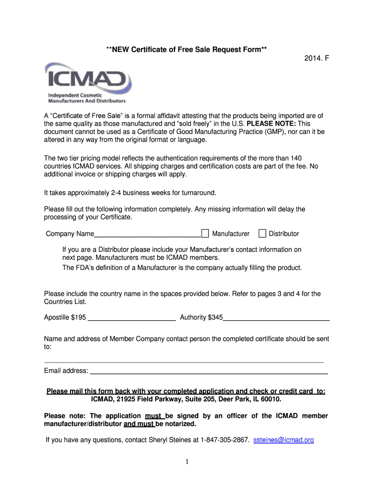 **NEW Certificate of Free Sale Request Form** 2014. F A Certificate of Free Sale is a formal affidavit attesting that the products being imported are of the same quality as those manufactured and