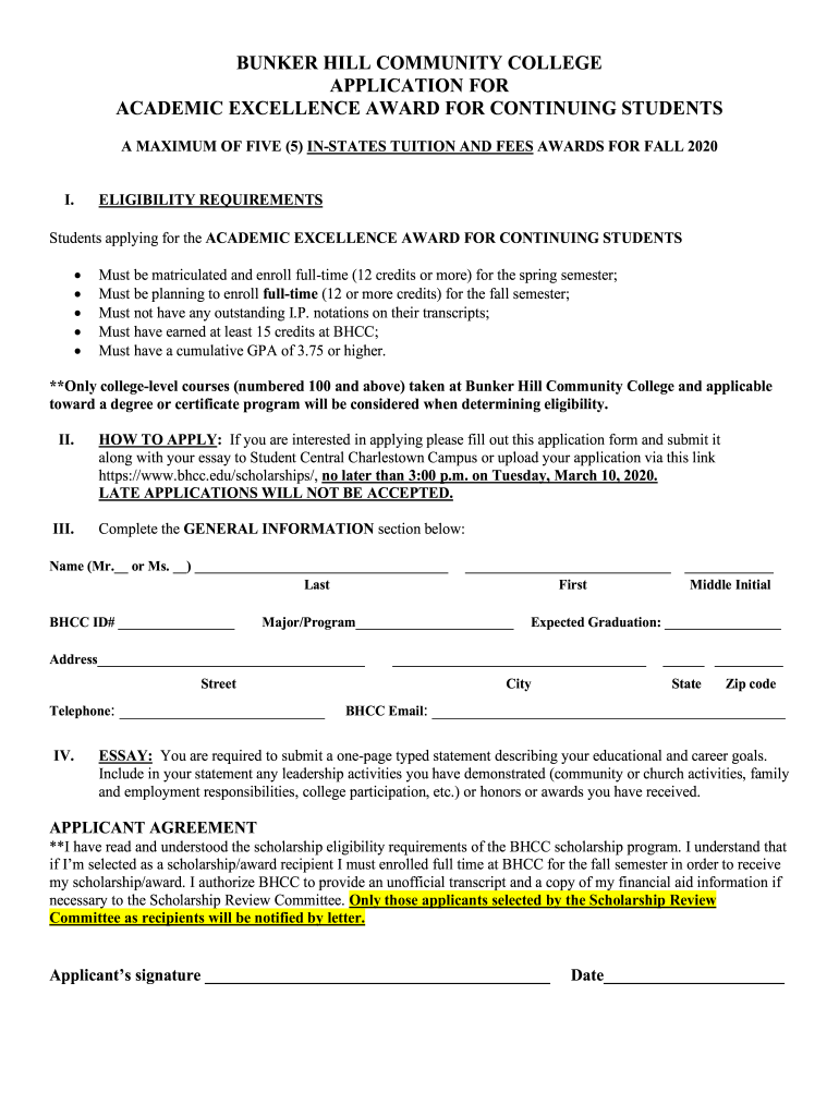 BUNKER HILL COMMUNITY COLLEGE APPLICATION FOR ACADEMIC EXCELLENCE AWARD FOR CONTINUING STUDENTS A MAXIMUM OF FIVE (5) INSTATES TUITION AND FEES AWARDS FOR FALL 2020 I.ELIGIBILITY REQUIREMENTSStudents