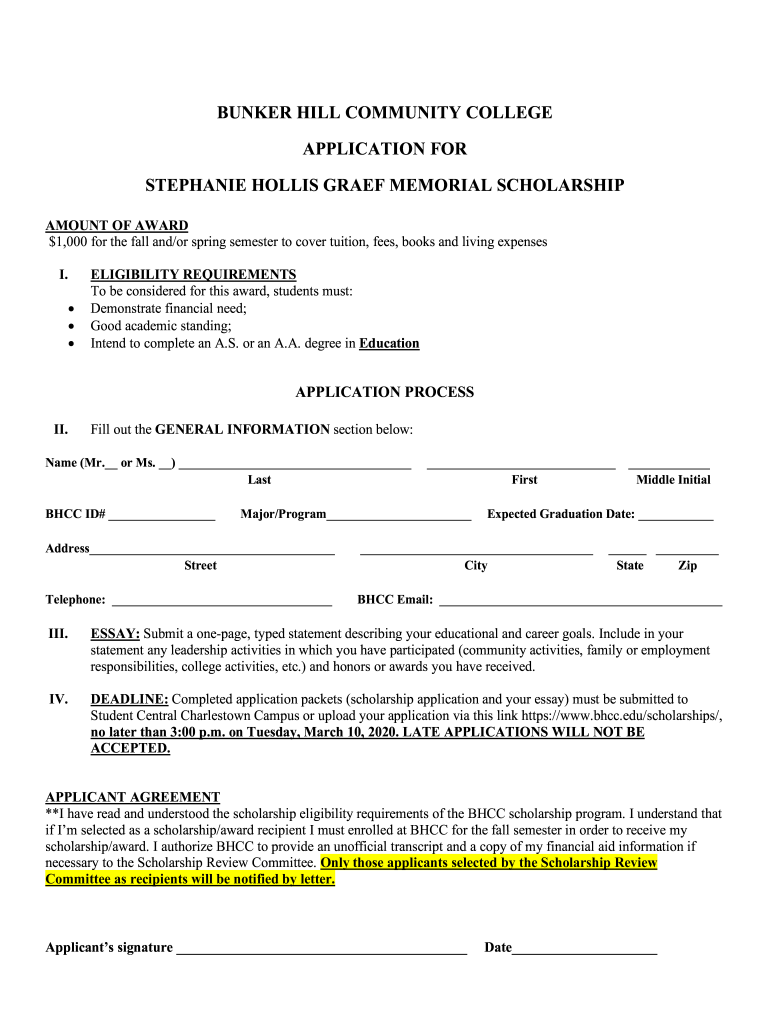 BUNKER HILL COMMUNITY COLLEGE APPLICATION FOR STEPHANIE HOLLIS GRIEF MEMORIAL SCHOLARSHIP AMOUNT OF AWARD $1,000 for the fall and/or spring semester to cover tuition, fees, books and living expenses