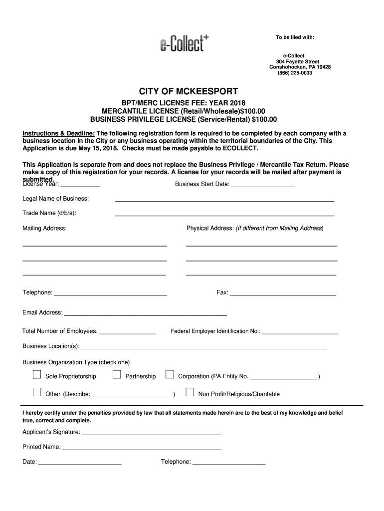 To be filed with:collect 804 Fayette Street Conshohocken, PA 19428 (866) 2250033CITY OF MCKEESPORT BPT/MERE LICENSE FEE: YEAR 2018 MERCANTILE LICENSE (Retail/Wholesale)$100.00 BUSINESS PRIVILEGE LICENSE