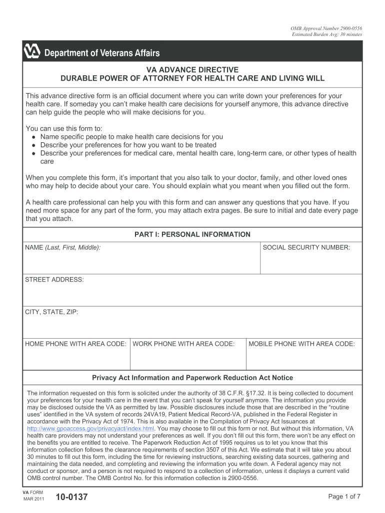 OMB Approval Number 29000556 Estimated Burden Avg: 30 minutes VA ADVANCE DIRECTIVE DURABLE POWER OF ATTORNEY FOR HEALTH CARE AND LIVING WILL Thisadvancedirectiveformisanofficialdocumentwhereyoucanwritedownyourpreferencesforyour