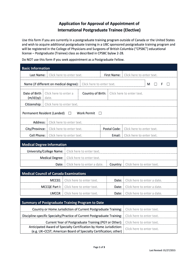 Application for Approval of Appointment of International Postgraduate Trainee (Elective) Use this form if you are currently in a postgraduate training program outside of Canada or the United States