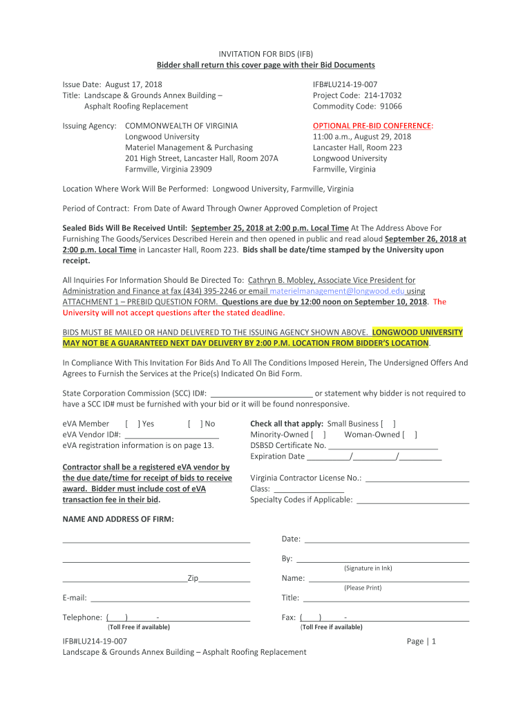 INVITATION FOR BIDS (IF) Bidder shall return this cover page with their Bid Documents Issue Date: August 17, 2018, Title: Landscape & Grounds Annex Building Asphalt Roofing Replacement#LU21419007