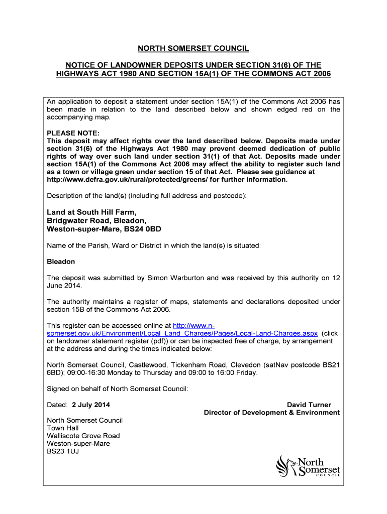 Get the free NORTH SOMERSET COUNCIL NOTICE OF LANDOWNER DEPOSITS UNDER SECTION 31(6) OF THE HIGHW...
